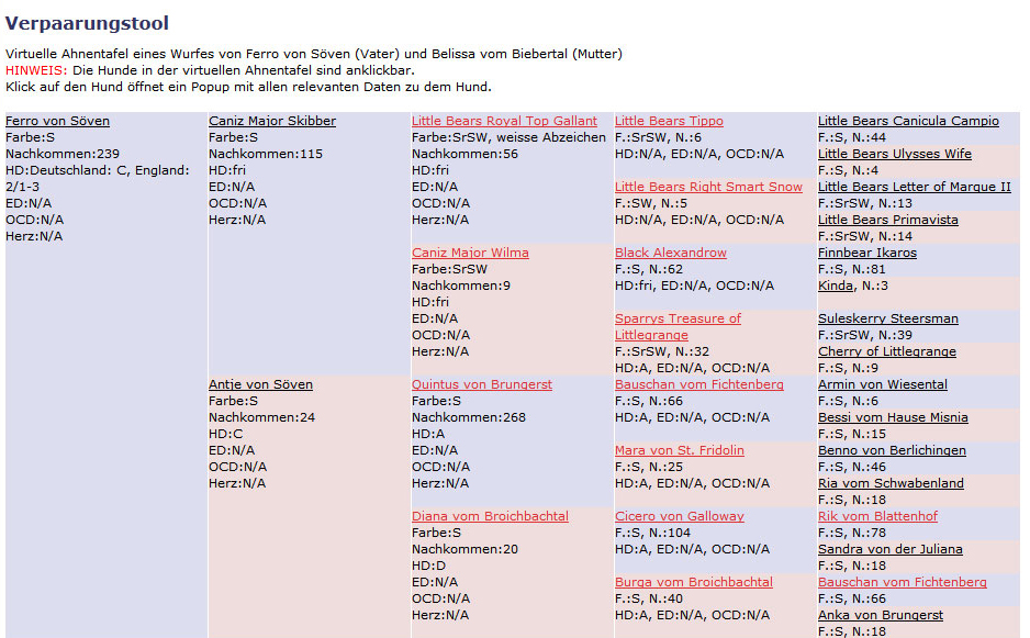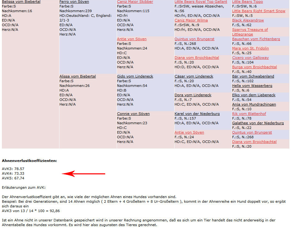 Wie Sie sehen, sind einige Hunde rot unterlegt. Dies bedeutet, dass sie mindestens doppelt in der Ahnentafel vorkommen. Im unteren Bereich wird der Ahnenverlust-Koeffizient errechnet. Bei den einzelnen Hunden sind deren Gesundheitsauswertungen und ist die Anzahl der Nachkommen abzulesen. N/A bedeutet nicht ausgewertet.