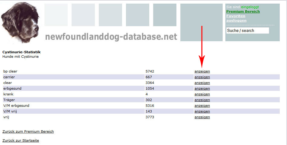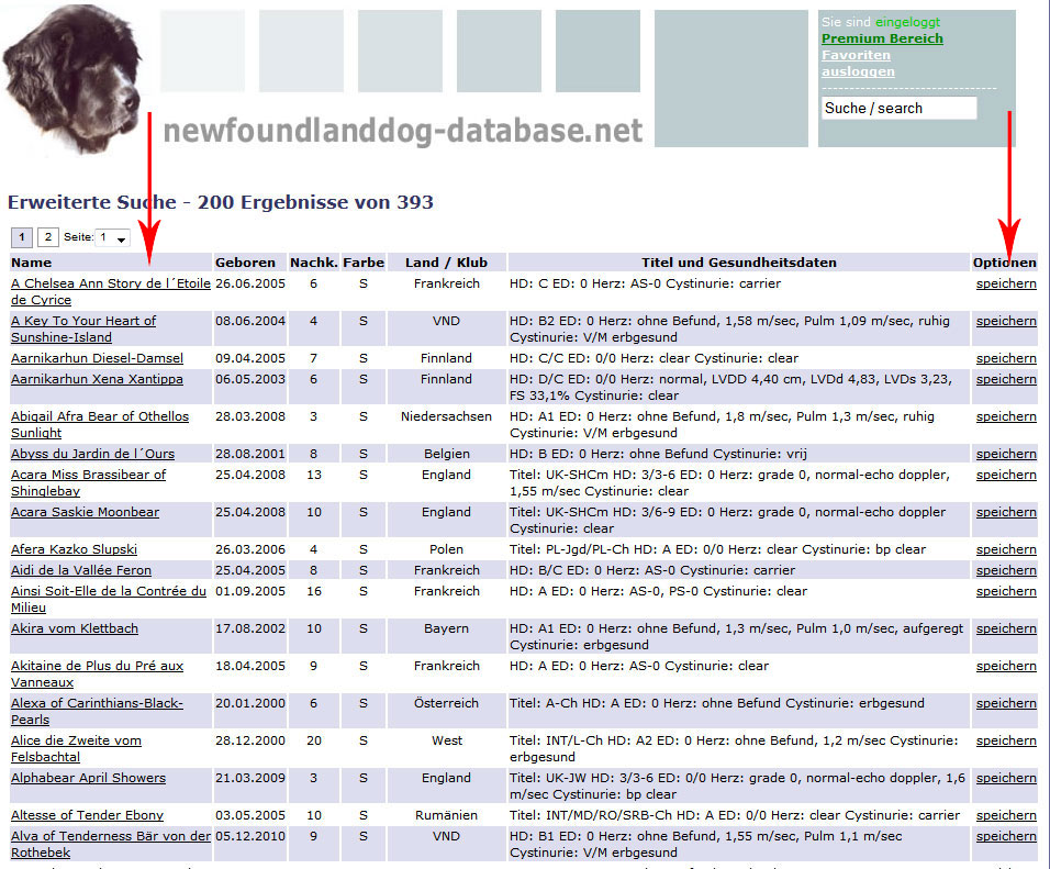 Der rote Pfeil links zeigt Ihnen den direkten Link zum einzelnen Hund, auf der rechten Seite können Sie den Hund als Favoriten speichern.