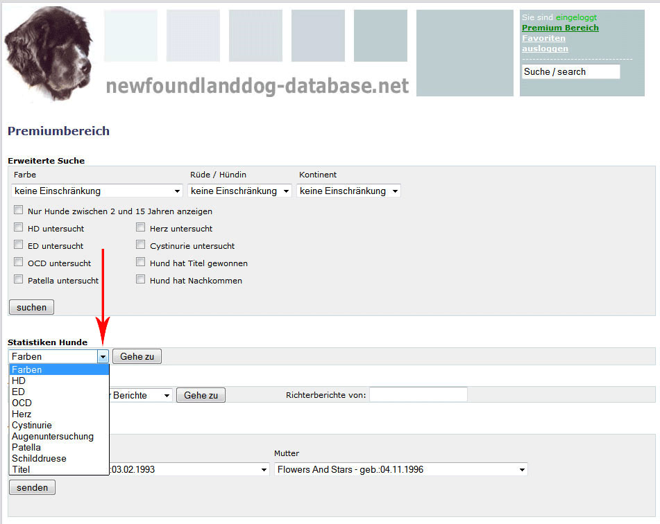 Hier können Sie oben die Farbe, Rüde oder Hündin und einen Kontinent auswählen oder auch keine Einschränkung machen.