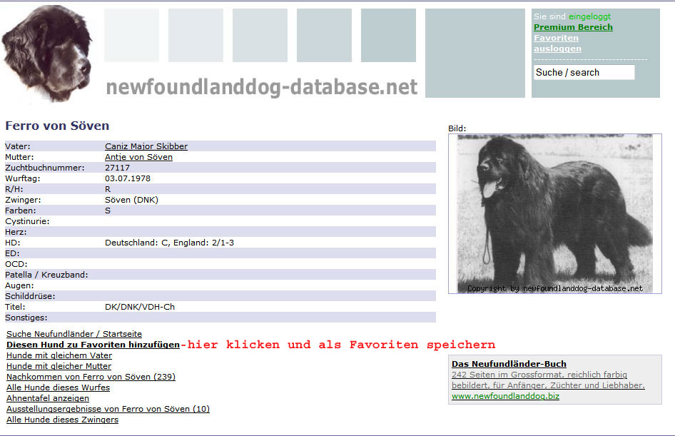 Der rote Pfeil links zeigt Ihnen den direkten Link zum einzelnen Hund, auf der rechten Seite können Sie den Hund als Favoriten speichern.