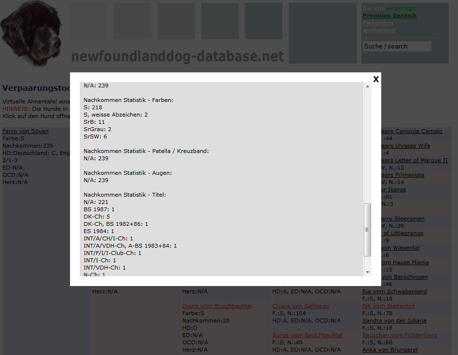 Nun können Sie hier auf jeden beliebigen Hund klicken.Es öffnet sich ein Popup-Fenster, in dem sämtliche Gesundheitsergebnisse und Titel der Nachkommen angezeigt werden.