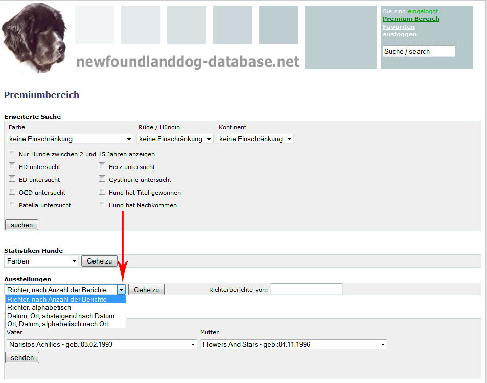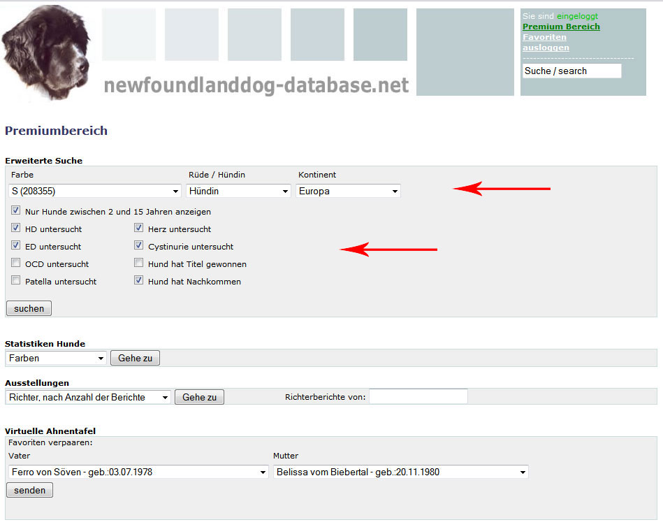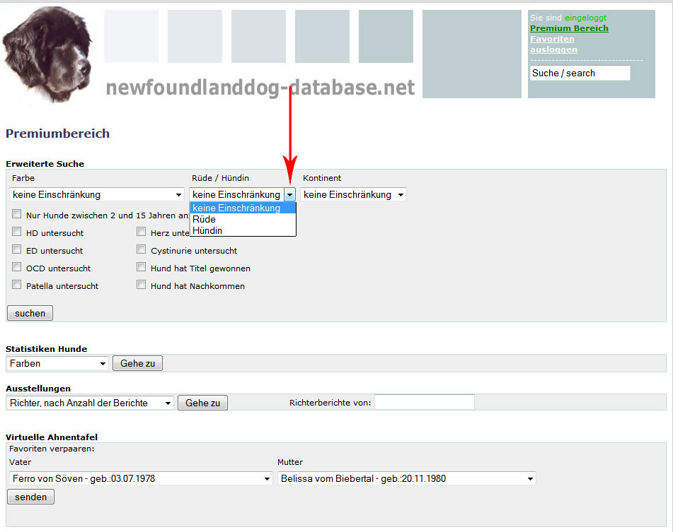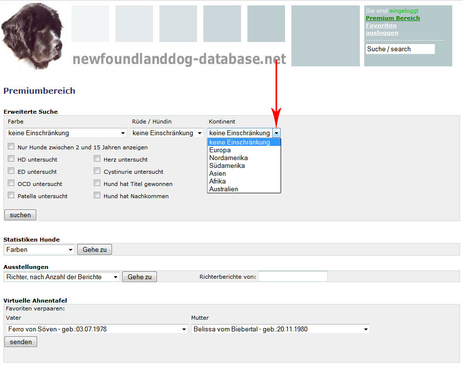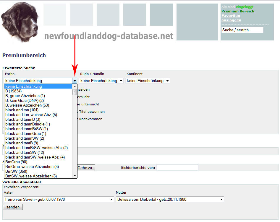Hier können Sie oben die Farbe, Rüde oder Hündin und einen Kontinent auswählen oder auch keine Einschränkung machen.